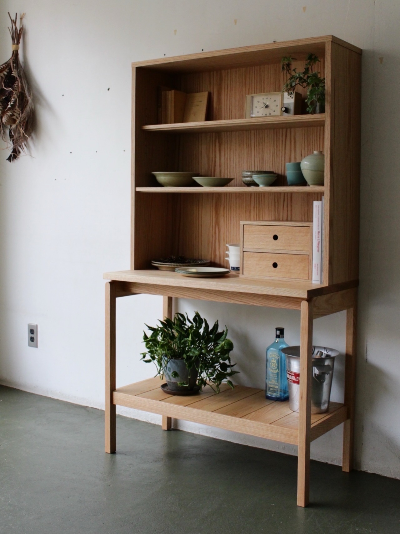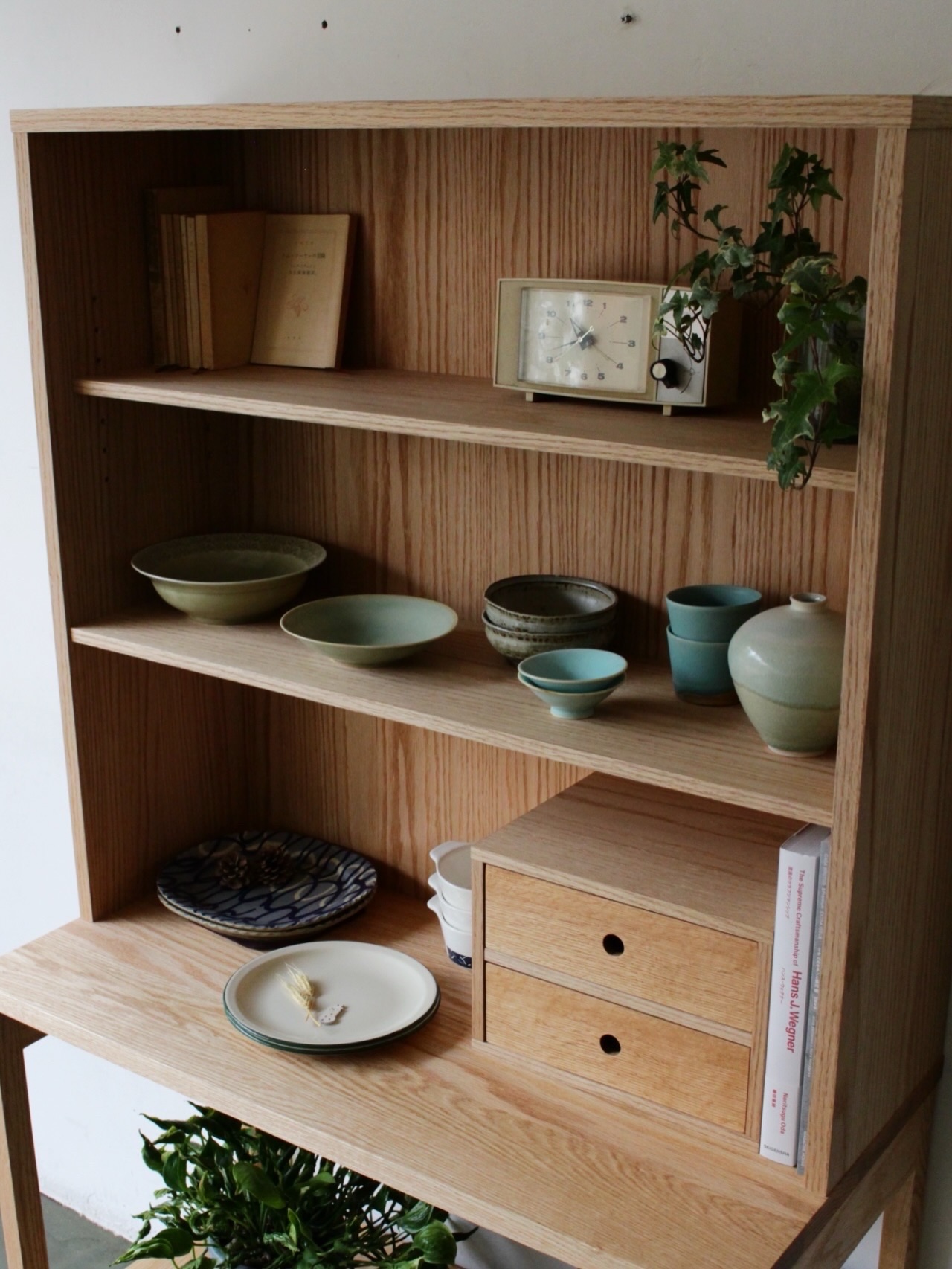 オイル仕上の素朴な風合が優しい、シンプルなデザインのシェルフが入荷しました。食器棚としても本棚としても抜群の収納力。植物や照明器具、お気に入りのコレクションを飾っても楽しいですね。下方部の開口部には、籐かごやワイヤーのかごを置いて日常使いの細々したものを収納するのもお勧めです。