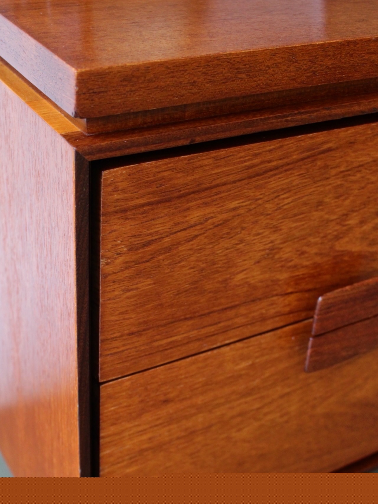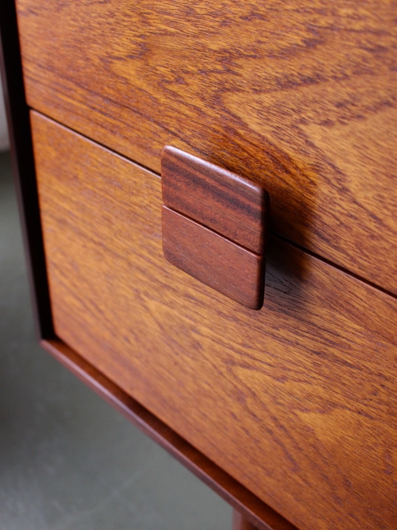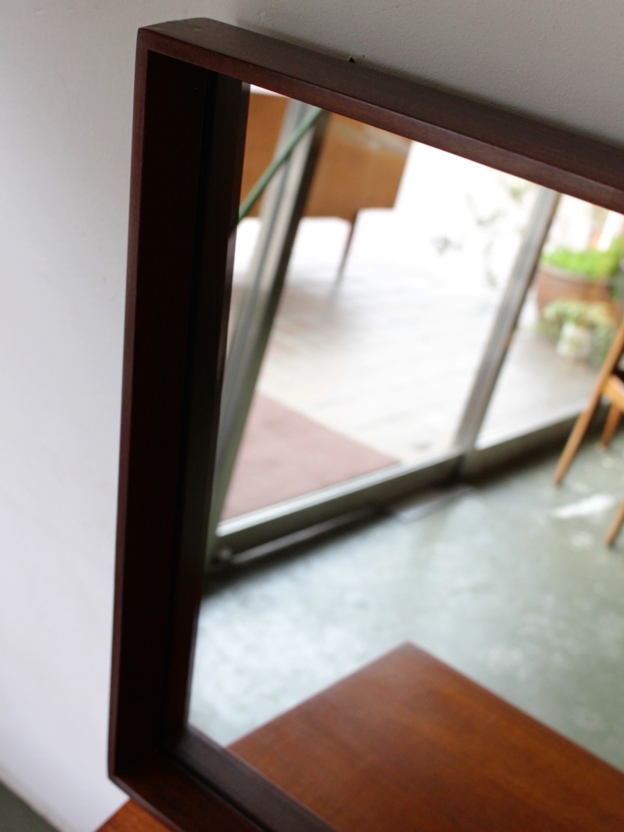| 備考 | ハンス.J.ウェグナーやフィン・ユールといった巨匠たちと肩を並べ、ミッドセンチュリー期の北欧を代表するインテリアデザイナーの一人 “ イブ・コフォド・ラーセン “ (Ib Kofod Larsen)。彼がG-PLANにデザインを提供し、1960年代のごく限られた時期にしか製作されなかったドレッサーが入荷しました。 ボックス型の迫力あるミラーと左右非対称の引出しが目を引きます。主材はチーク材ですが、引出しの取手のみ贅沢にローズウッドを使用。チーク材より深い色のローズウッドがアクセントになっていますね。また、引出し縁周りにスリットを入れる事により、引き出しの前板を立体的に見せています。引出しの取手を上下合わせたデザインも印象的です。 *天板の高さ : 700 mm |